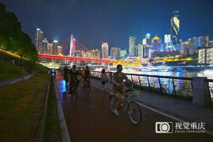 8月7日,北滨路滨江骑行道,市民一边健身锻炼,一边欣赏山城夜景。首席记者龙帆摄/视觉重庆