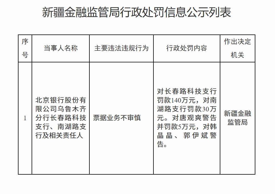 4月10日,新疆金融监管局行政处罚信息公示列表显示,北京银行股份有限公司乌鲁木齐分行长春路科技支行、南湖路支行因票据业务不审慎分别被罚款140万元、30万元。责任人唐某爽被警告并罚款5万元,韩某晶、郭某斌被警告。