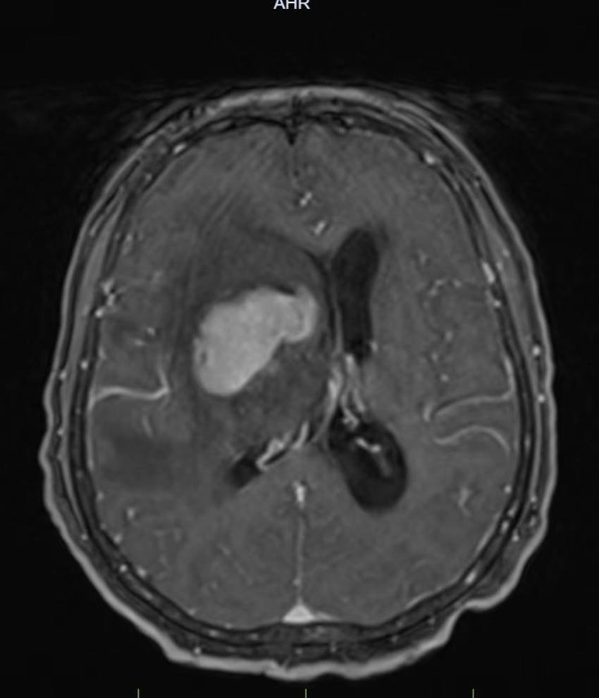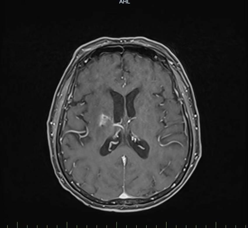 患者王阿姨,66岁,确诊脑肿瘤一月余。入院时,她不仅存在右侧基底节及脑干区巨大占位,伴有严重神经压迫,还合并多项并发症,身体状况极差,长期卧床,生活完全无法自理。面对这一复杂危重的病情,长春国文医院头颈食管放化疗科团队没有采取单一技术“单点突破”式治疗,而是迅速启动多维度综合评估,科学制定了个体化短疗程精准放疗方案,并同步开展全程精细化管理。